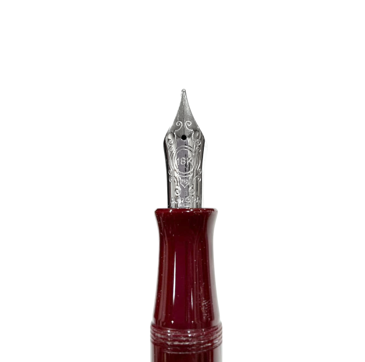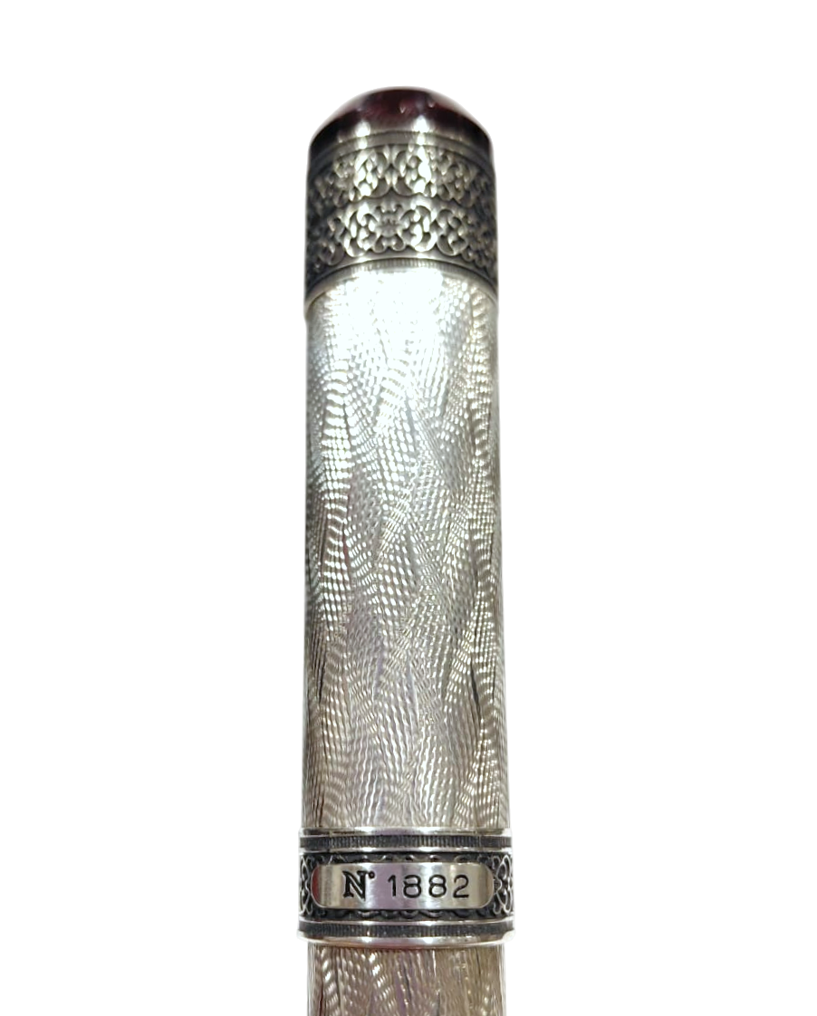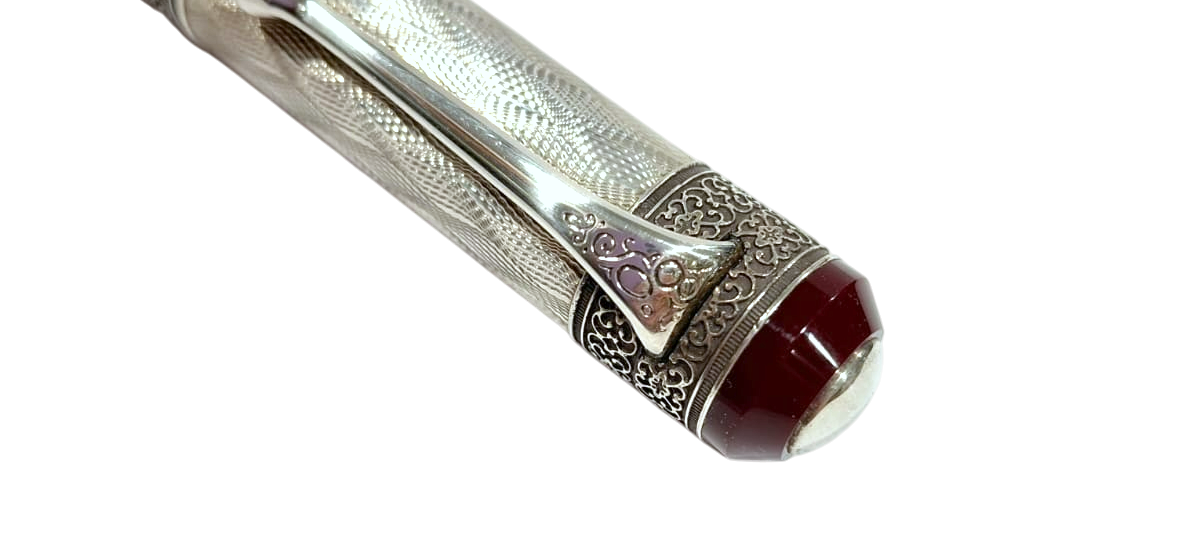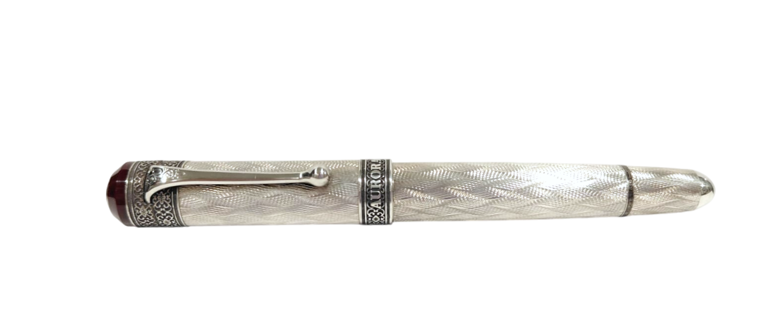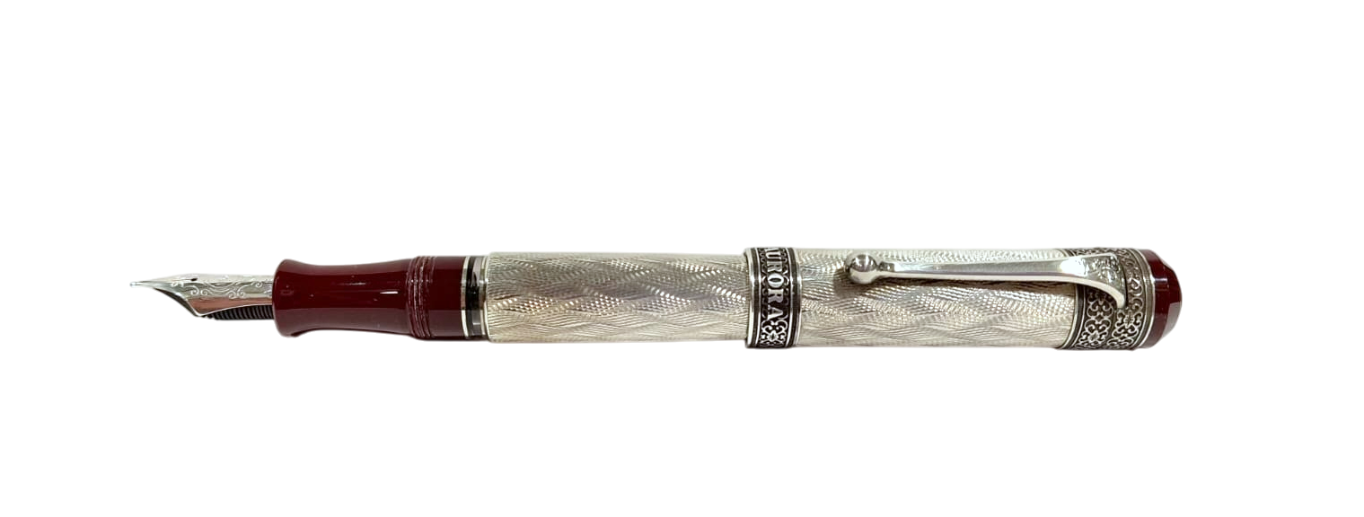Raffinata ed elegante penna stilografica Aurora realizzata in argento massiccio 925 cesellato con lavorazione guilloche flamè, Testina in resina bordeaux con sigillo in argento. Cappuccio a vite, pennino in oro bianco 18kt placcato rodio, finemente decorato. Caricamento a stantuffo.