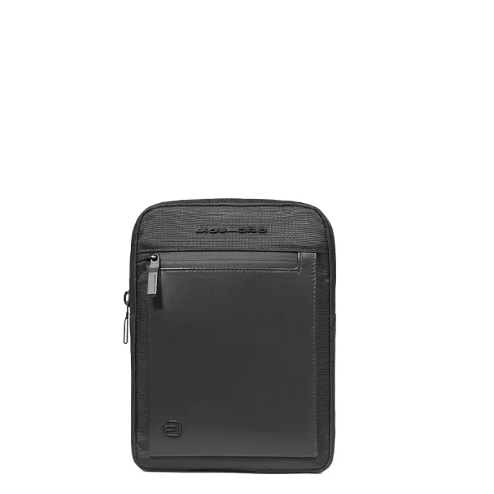 Raffinato borsello, realizzato in resistente tessuto con inserti in pelle, disponibile in blu o nero, con tasca zippata e taschina verticale frontale .