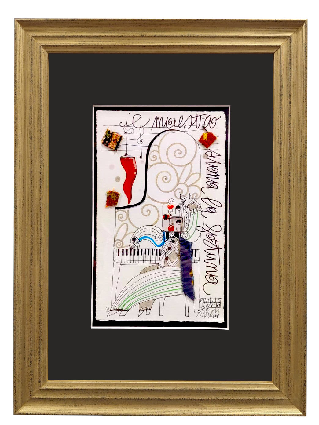 Bellissimo pezzo unico realizzato a china e con applicazioni di carte e stoffe. L'opera fa parte di una serie che l'artista ha dedicato al tema della fortuna e della scaramanzia.