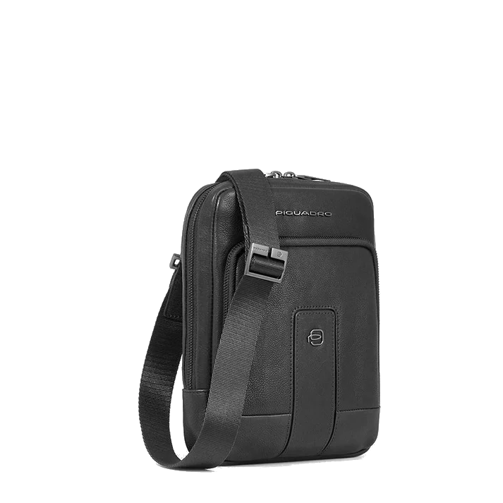 Raffinato borsello, realizzato in pelle, disponibile in nero, con tasca zippata e taschina verticale frontale .