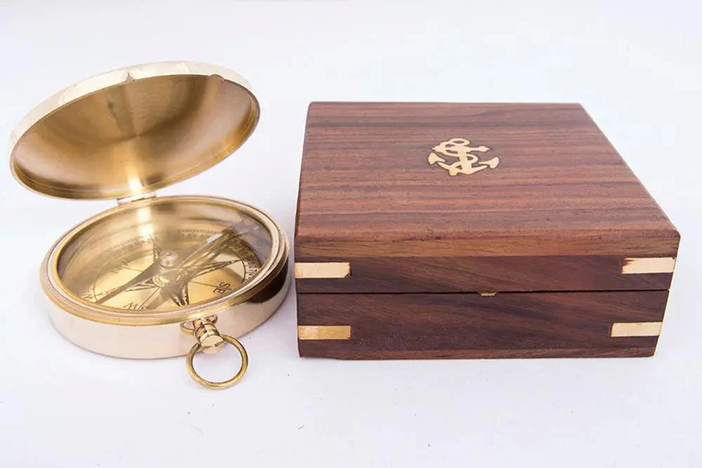 Elegante bussola in ottone racchiusa in una raffinata scatola in legno artigianale, impreziosita da un’ancora in metallo applicata sul coperchio. Il quadrante inciso con rosa dei venti conferisce a questo oggetto un fascino autentico e senza tempo, perfetto per gli amanti della navigazione, del design nautico e degli oggetti vintage.