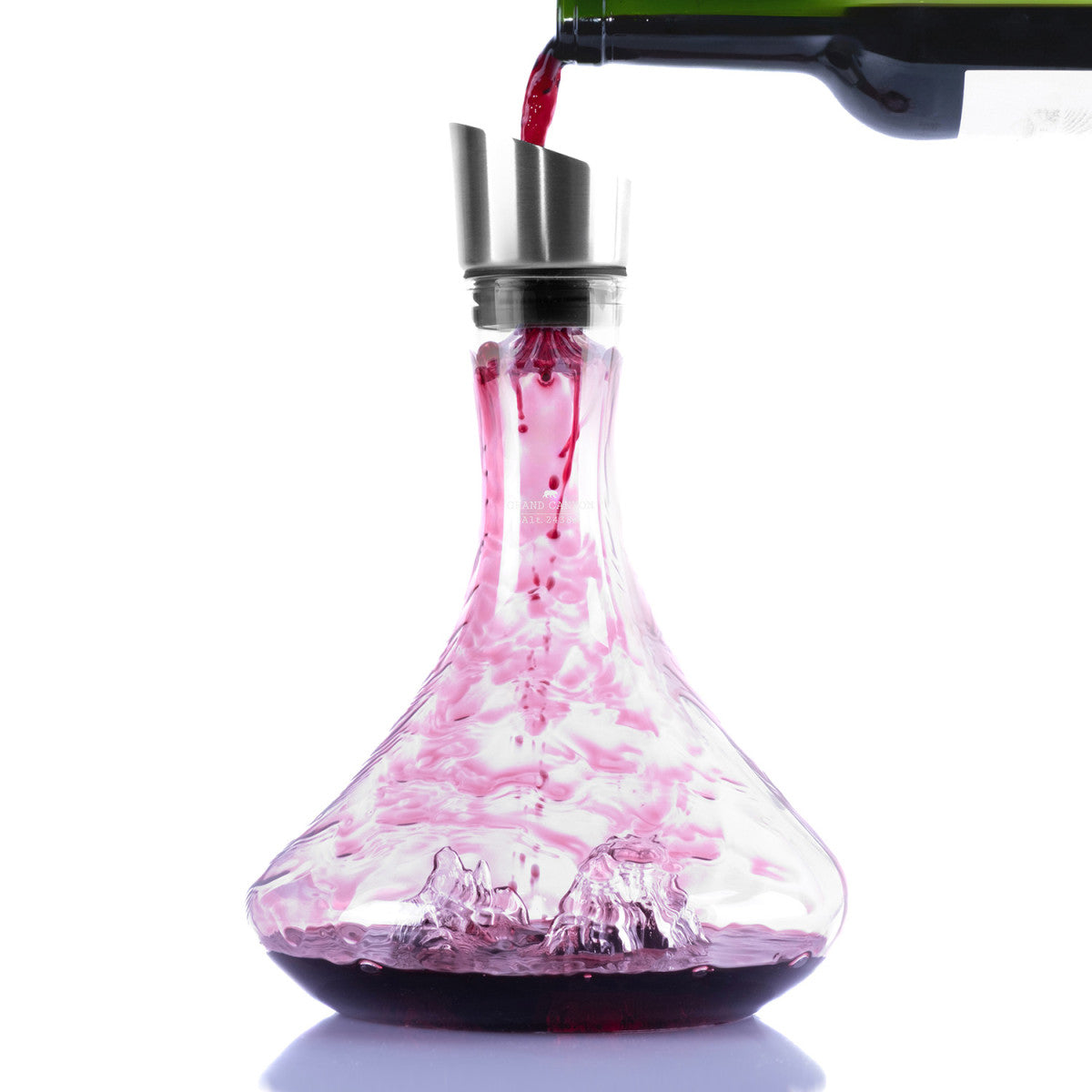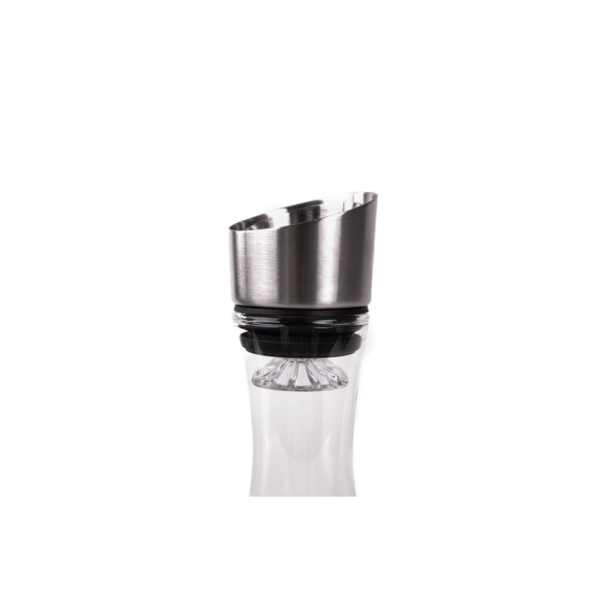 Raffinato decanter in vetro, realizzato a mano con tappo che incorpora filtro aeratore e beccuccio, ideale per un'esperienza di degustazione ottimale. Il tappo non è ermetico, per favorire il contatto tra il vino e l'ossigeno, che favorisce il rilascio degli aromi.