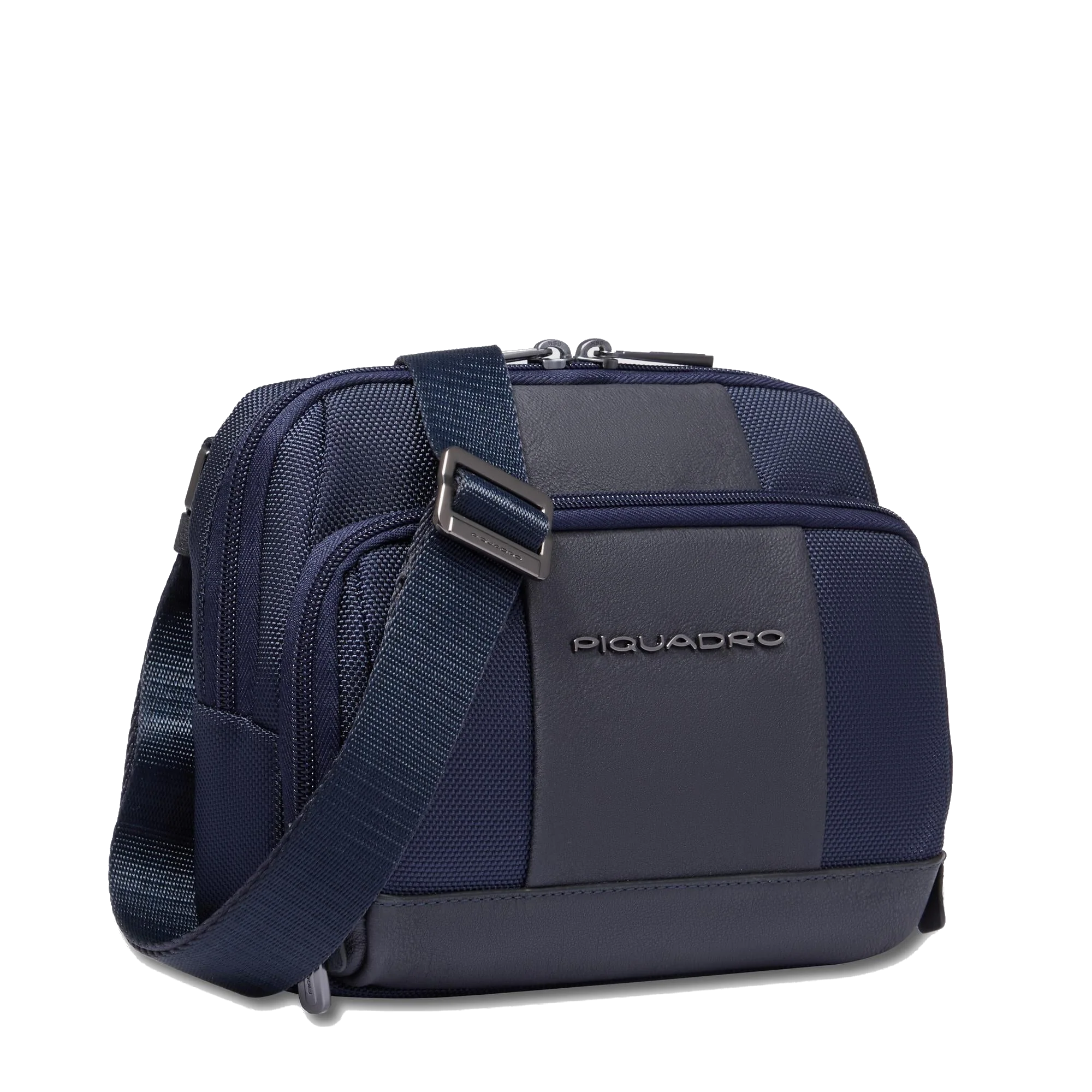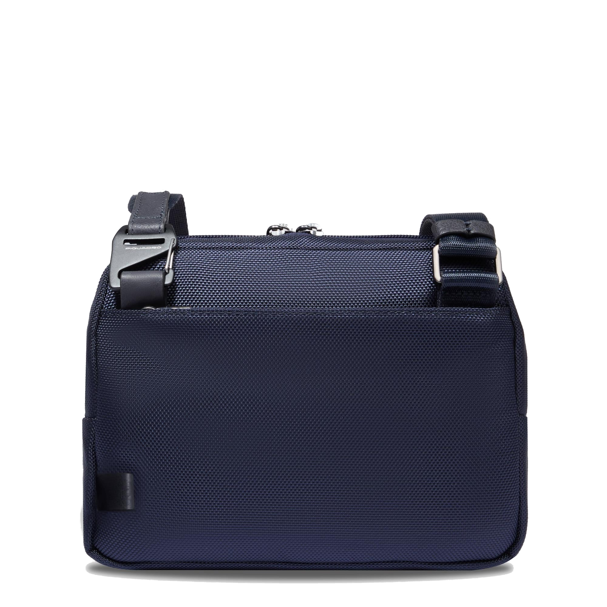 Tracolla in tessuto, regolabile. Sulla parte frontale e posteriore sono presenti comode tasche. L'interno è strutturato con tasca porta IPAD MINI®/ MINI®2/ MINI®3.e porta oggetti. Completa di protezione anti frode RFID e tasca interna per Piquadro Smart Tracker.