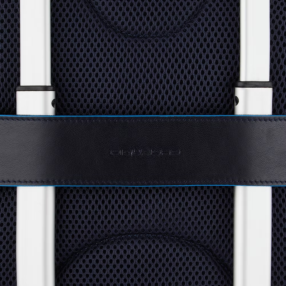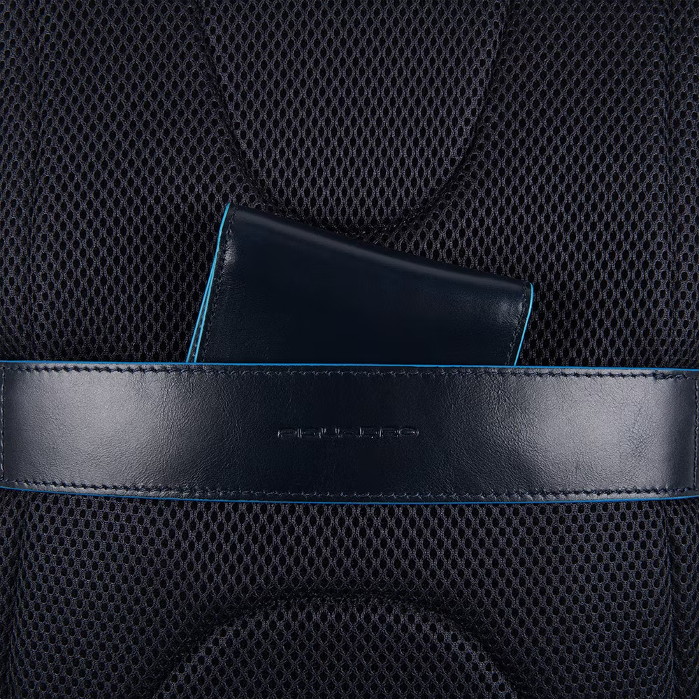 Pratico e super accessoriato zaino in pelle di vitello spatolato, Bordi con taglio vivo dipinto a mano in turchese. Disponibile in blu, mogano e nero.