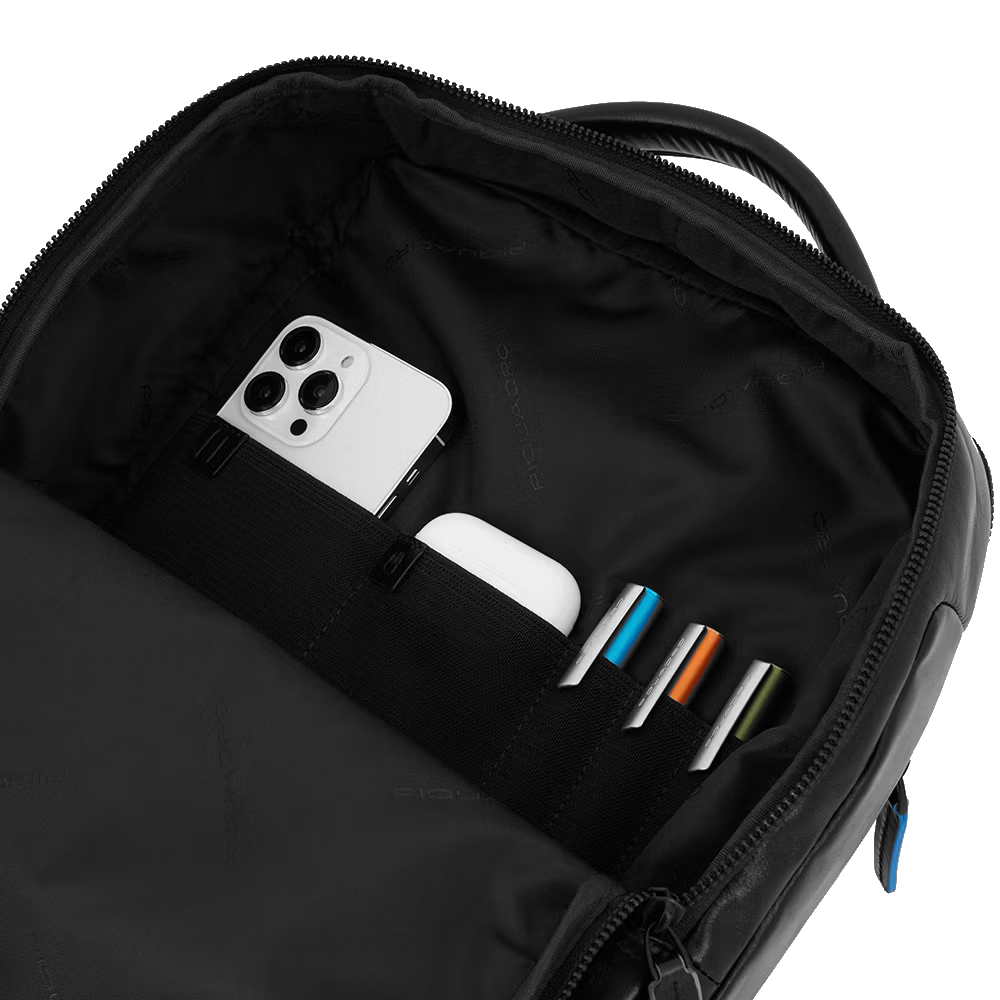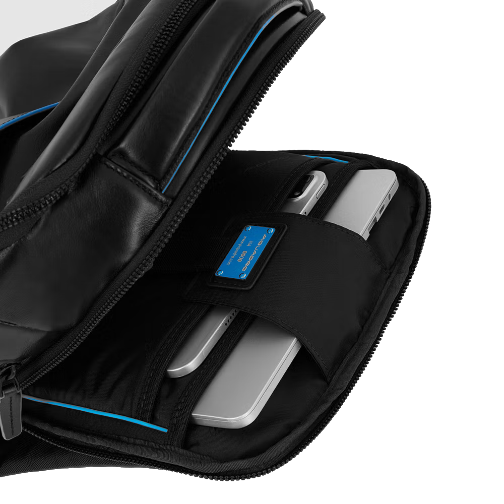 Struttura semirigida. Tasca frontale con zip, tasche laterali portabottiglia/ombrello, sistema d´aggancio del trolley. Può contenere un pc da 14" nello scomparto imbottito interno, shock absorber. Dotato di tasca porta iPad® 10,2'', iPad® Air 10,9'' e iPad®Pro 11''.organizzazione interna con tasche multifunzione e portapenne.