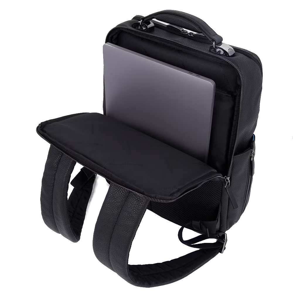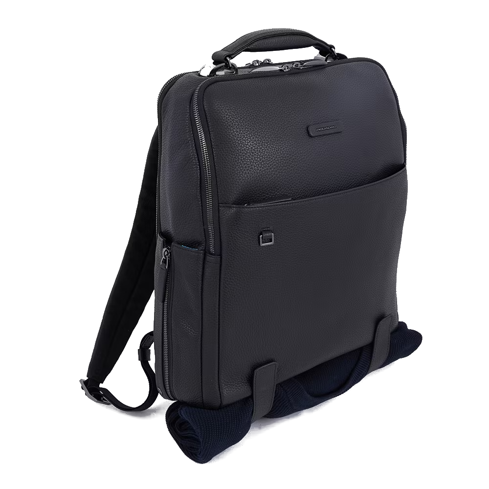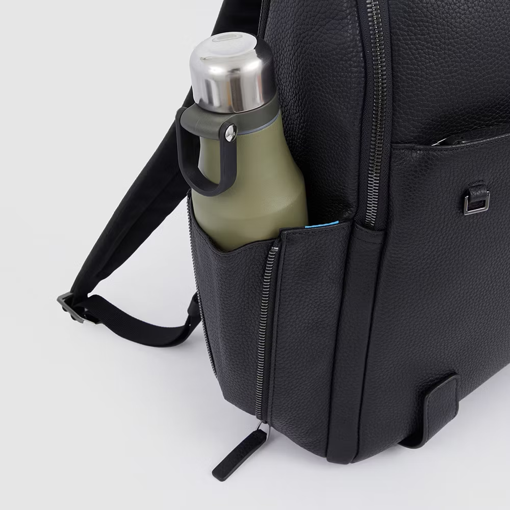 Elegante zaino professionale in pelle nera. Struttura semirigida. Può contenere un notebook da 15,6" nel vano interno imbottito, organizzato con tasche multifunzione e portatablet. Tasca frontale con zip e tasca laterale a scomparsa portabottiglia/ombrello. Aggancio trolley.