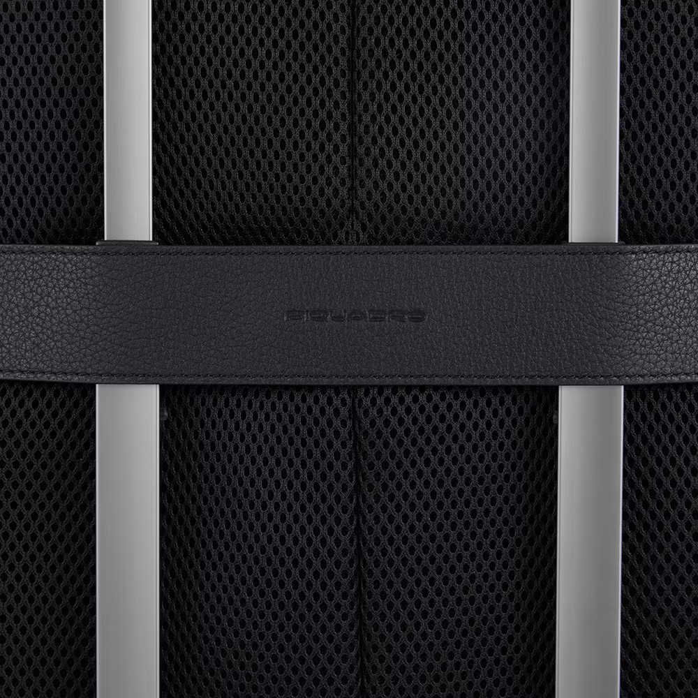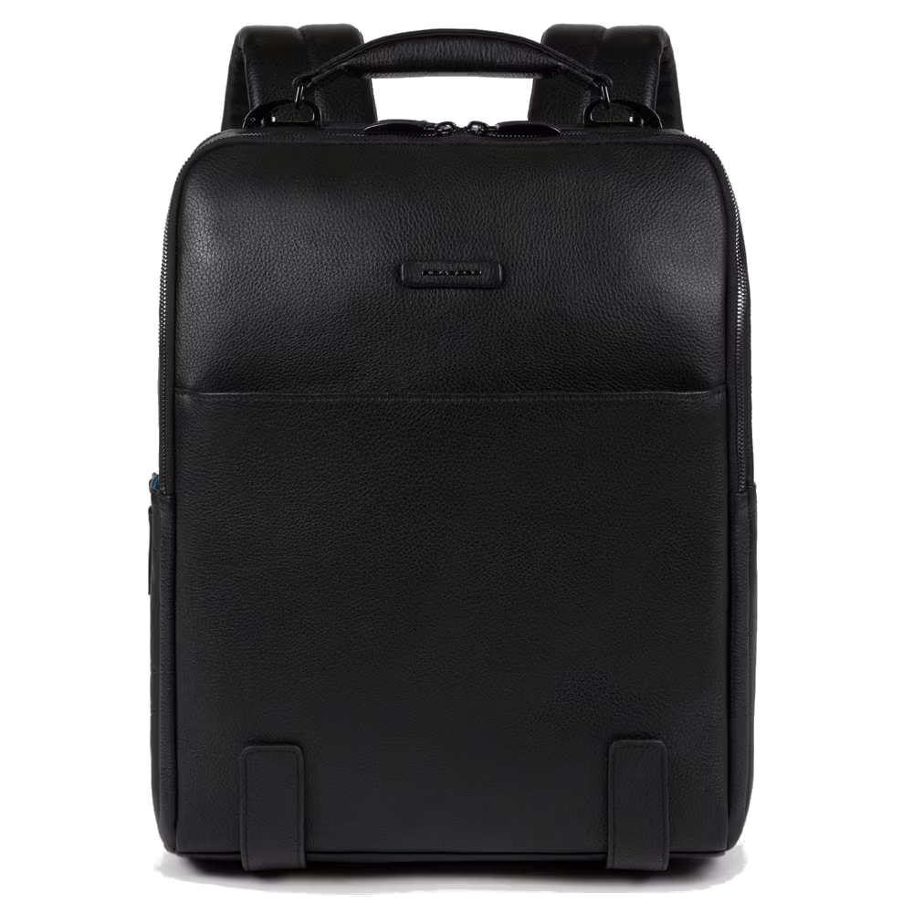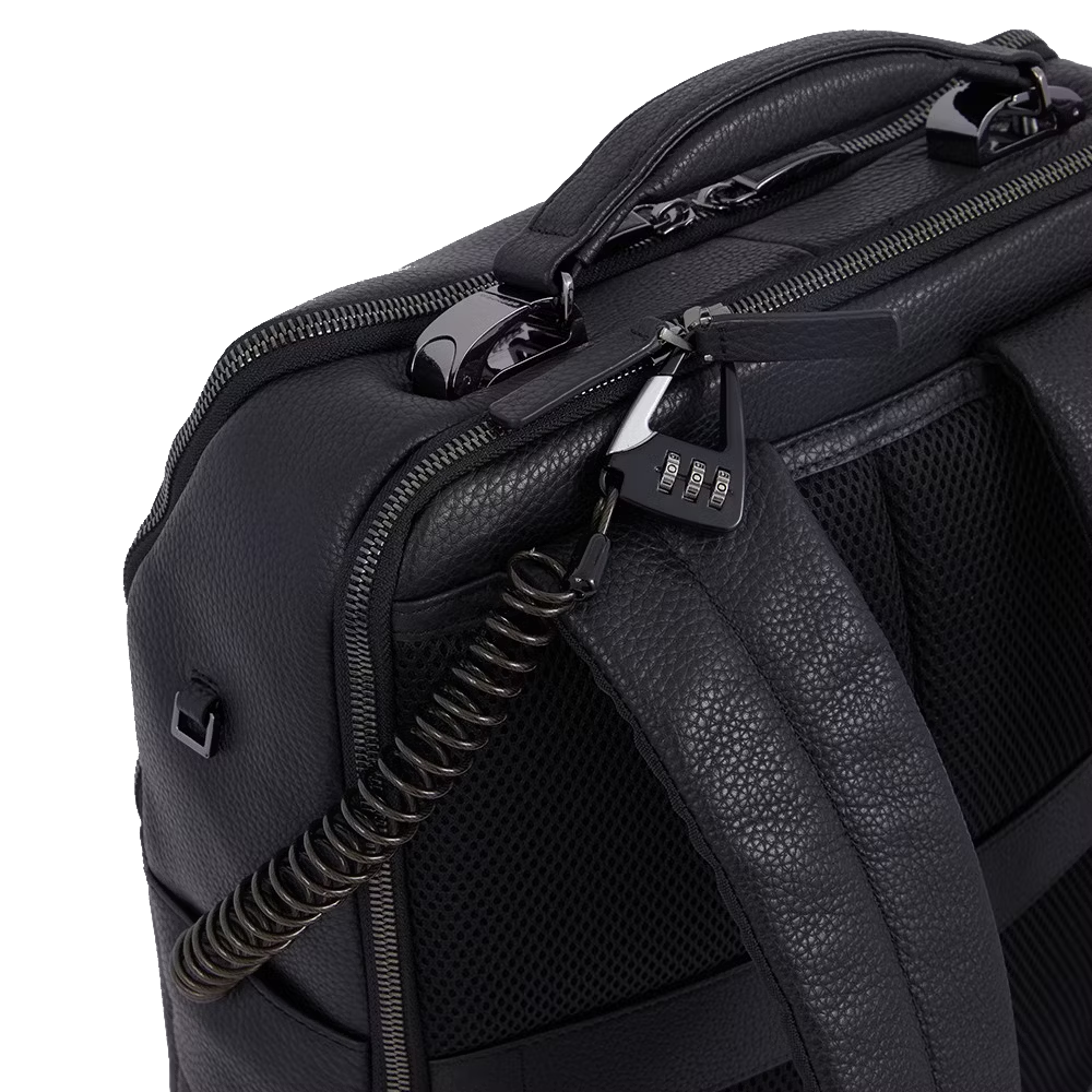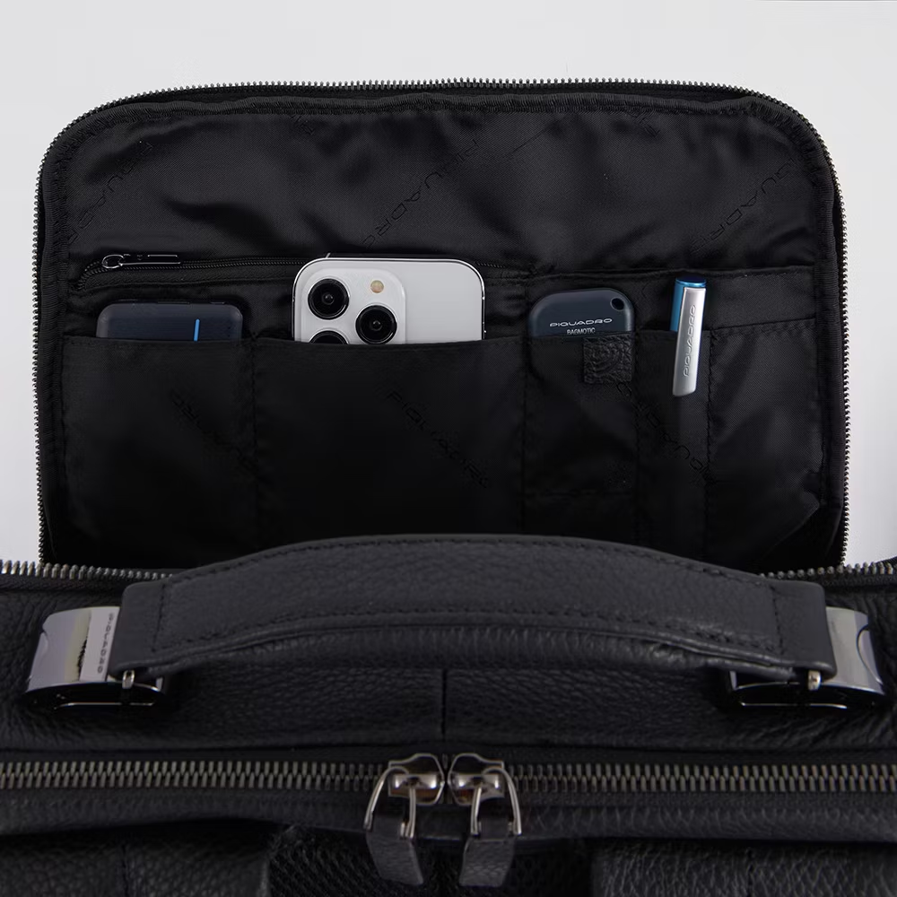 Elegante zaino professionale in pelle nera. Struttura semirigida. Può contenere un notebook da 15,6" nel vano interno imbottito, organizzato con tasche multifunzione e portatablet. Tasca frontale con zip e tasca laterale a scomparsa portabottiglia/ombrello. Aggancio trolley.