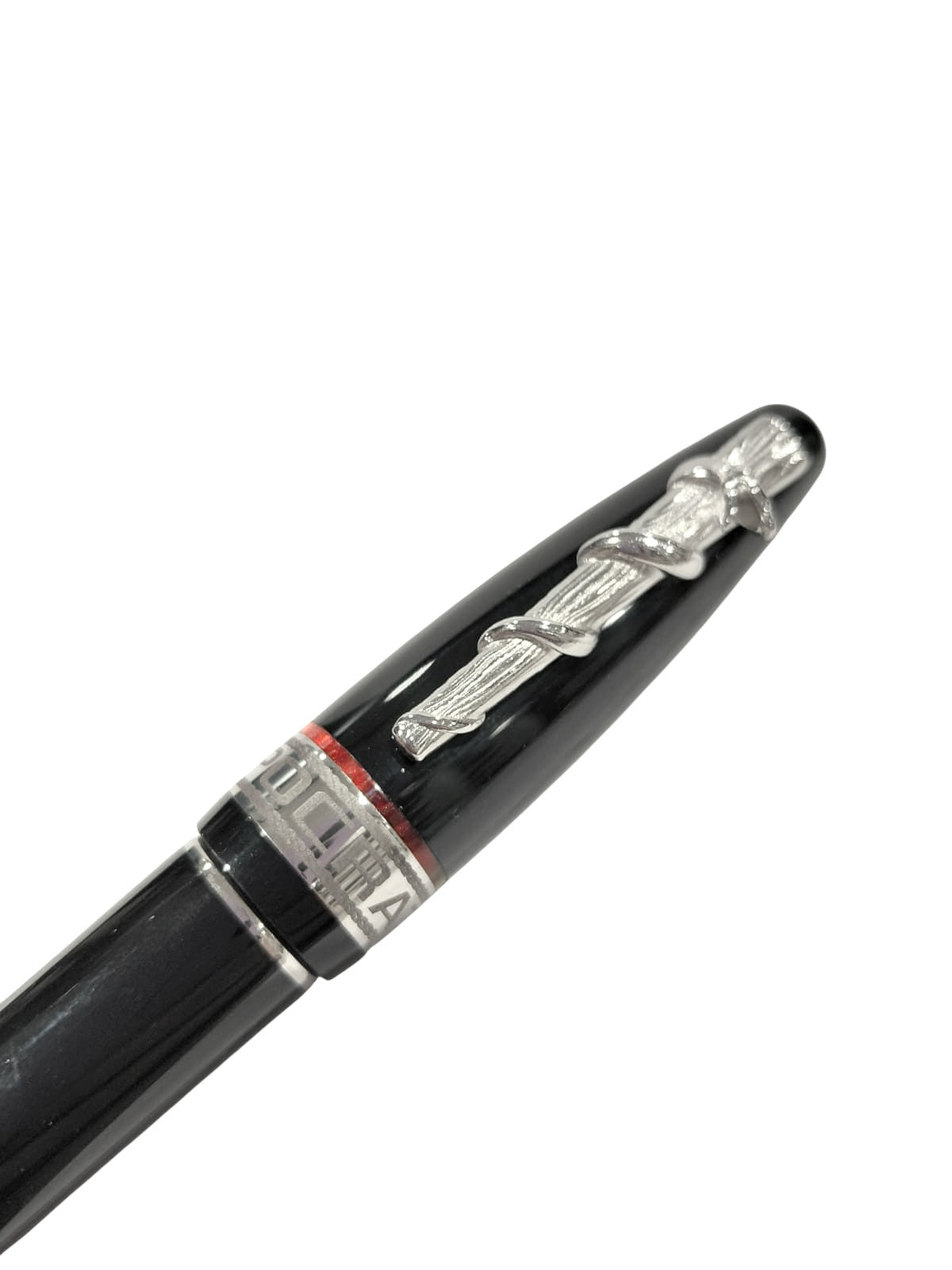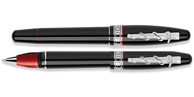 La penna Hippocratica è realizzata in una resina nera lucidissima, impreziosita da anellini bordeaux e finiture palladiate ed è caratterizzata da una clip scultura con il simbolo del bastone di Asclepio.