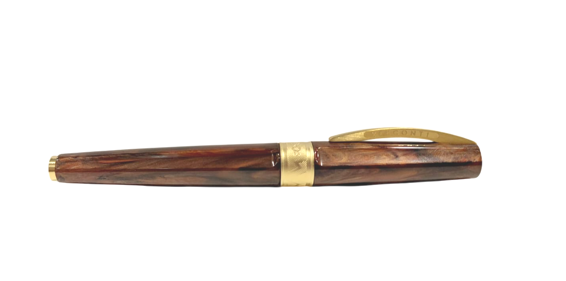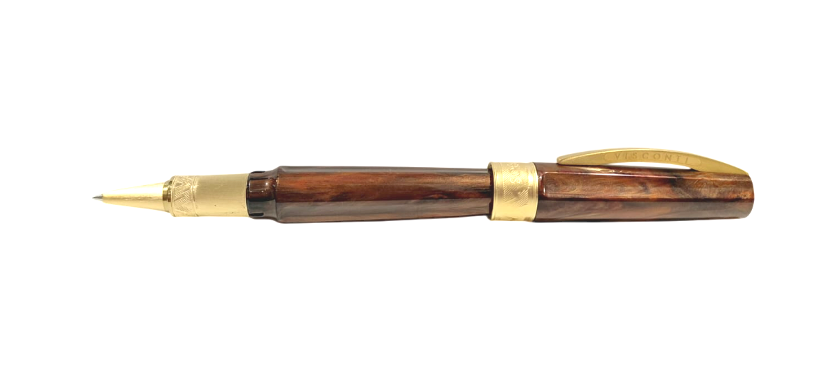 Raffinata penna roller Visconti della linea Mirage Mithos realizzata in resina acrilica lavorata a mano con colori sfumati con polvere oro, ciascuno corrispondente ad una divinità. A ciò si aggiunge la sezione centrale metallica anziché in resina, ma soprattutto la veretta centrale, sulla quale è incisa la scritta MYTHOS e la V di Visconti, stilizzata per ricordare il profilo del Monte Olimpo.