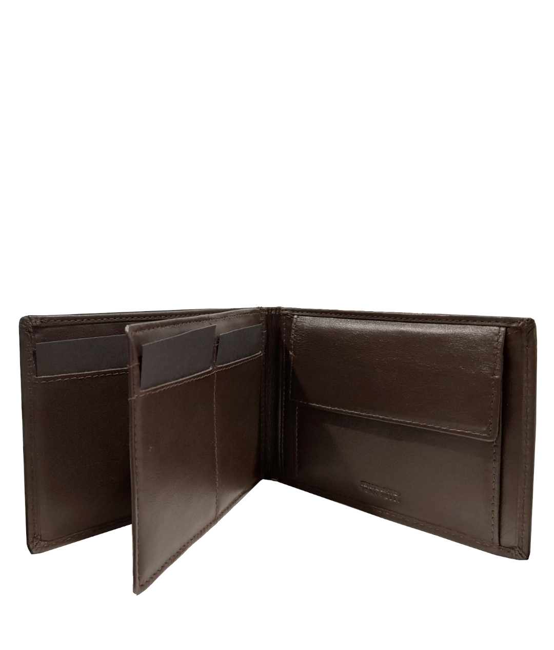 Raffinato portafogli da uomo in pelle spatolata. Interno organizzato con otto slot portacarte, portabadge retinato con apertura a libro, vano portabanconote con ulteriori quattro slot portacarte interni, portaspicci e taschina. Disponibile in testa di moro.