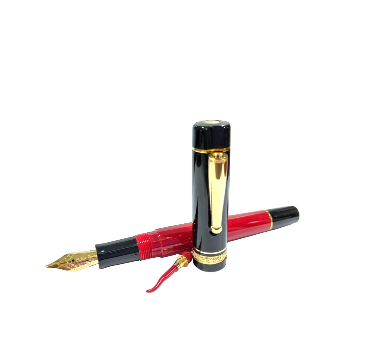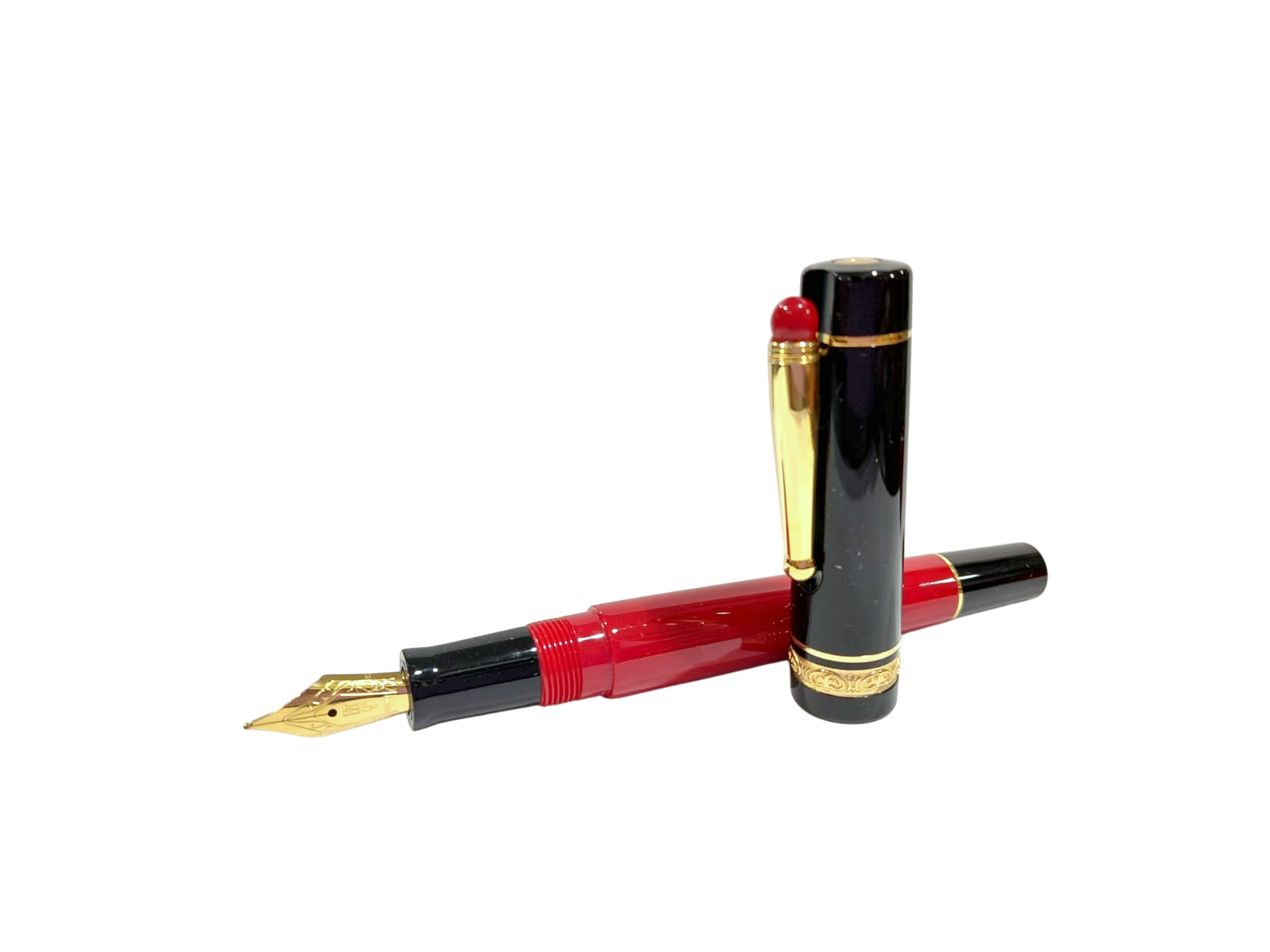 Pregiata penna stilografica realizzata in resina nera e rossa, tornita da blocco unico, con cappuccio a vite, clip in metallo armonico rodiato, anello decorativo con motivo a decorativo inciso di ispirazione greco romana, in metallo dorato.