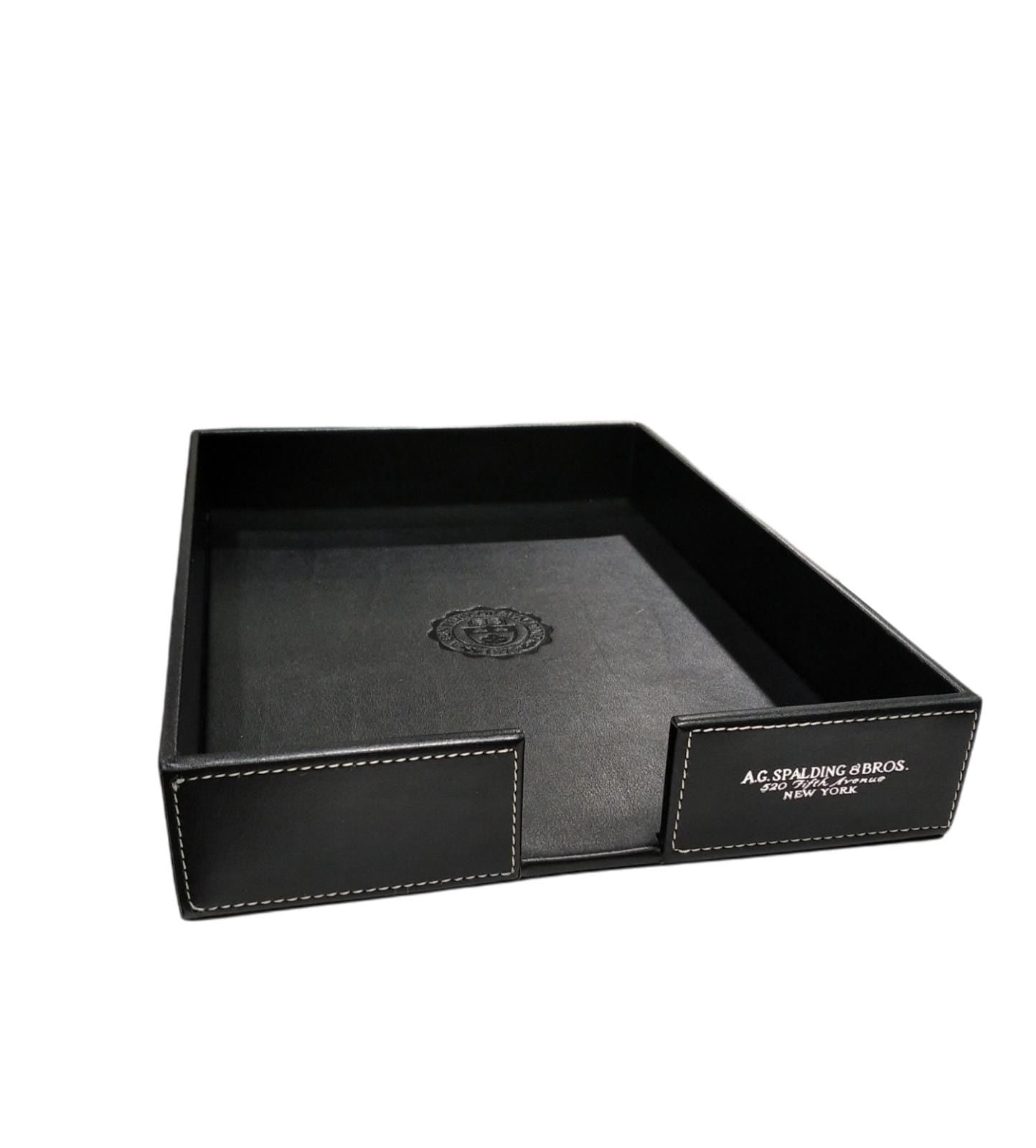 Raffinata vaschetta portadocumenti realizzata in pelle nera con impunture in contrasto. Logo impresso in colore argento.