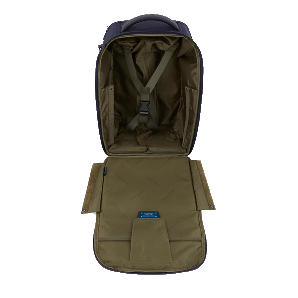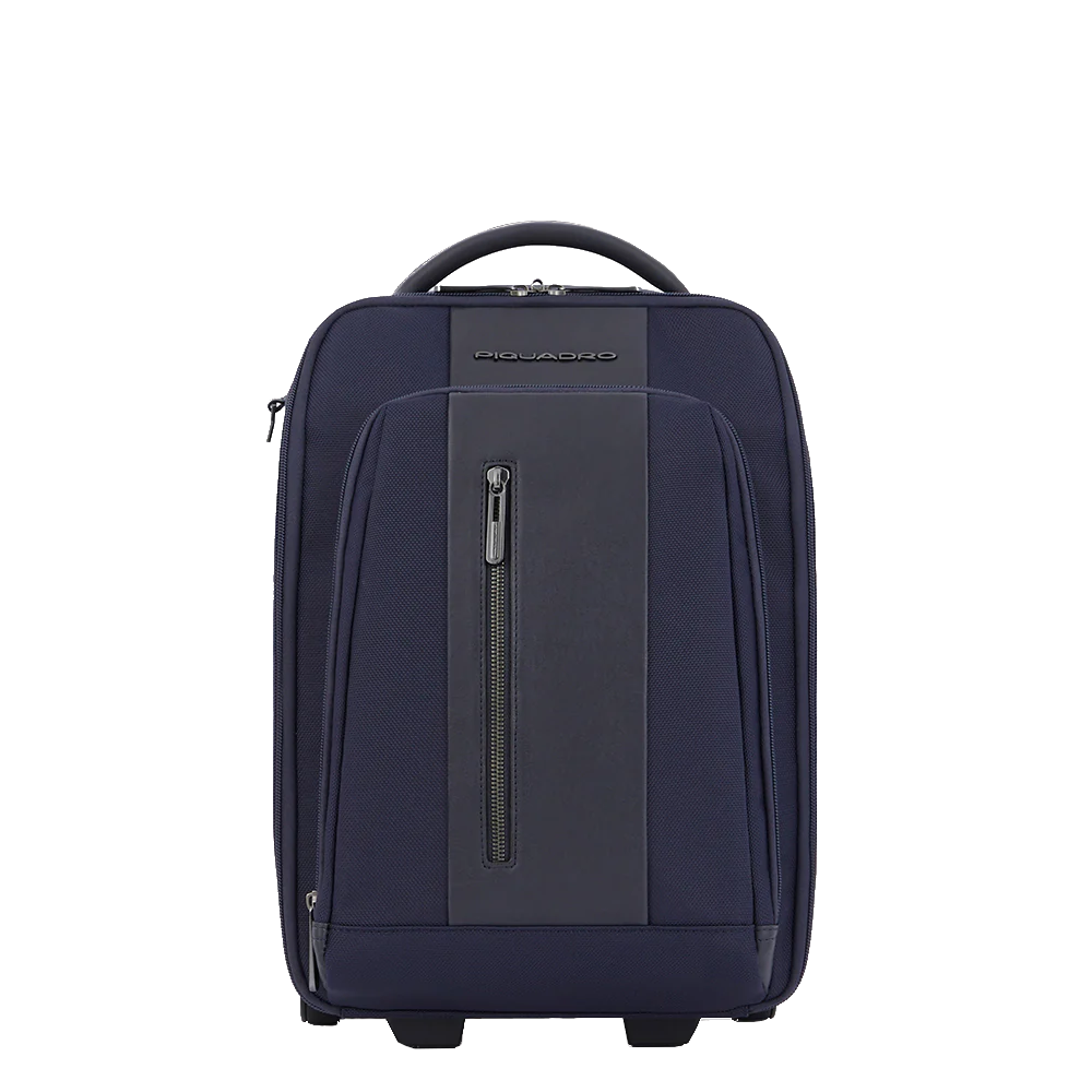 Raffinato trolley a cabina convertibile in zaino, monoscomparto, realizzato in tessuto antistrappo in poliestere. Disponibile in nero e blu. Chiusura lampo con doppia zip e blocchetto di sicurezza. Dotato di due ruote stabili e silenziose. Sistema trolley monoasta telescopico. Completo di spallacci regolabili,imbottiti a scomparsa e di vano porta ipad 12,9" e tasca porta air pods, portapenne, taschina connequ/airtag.