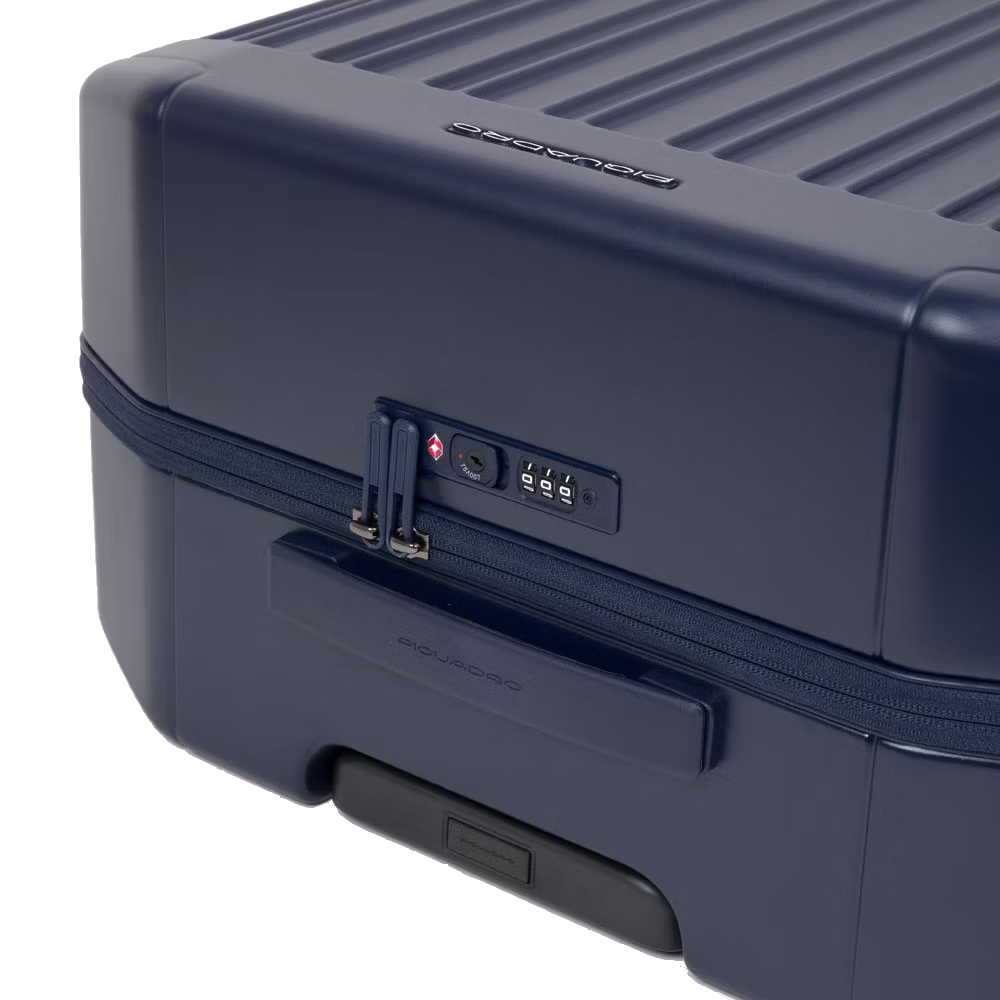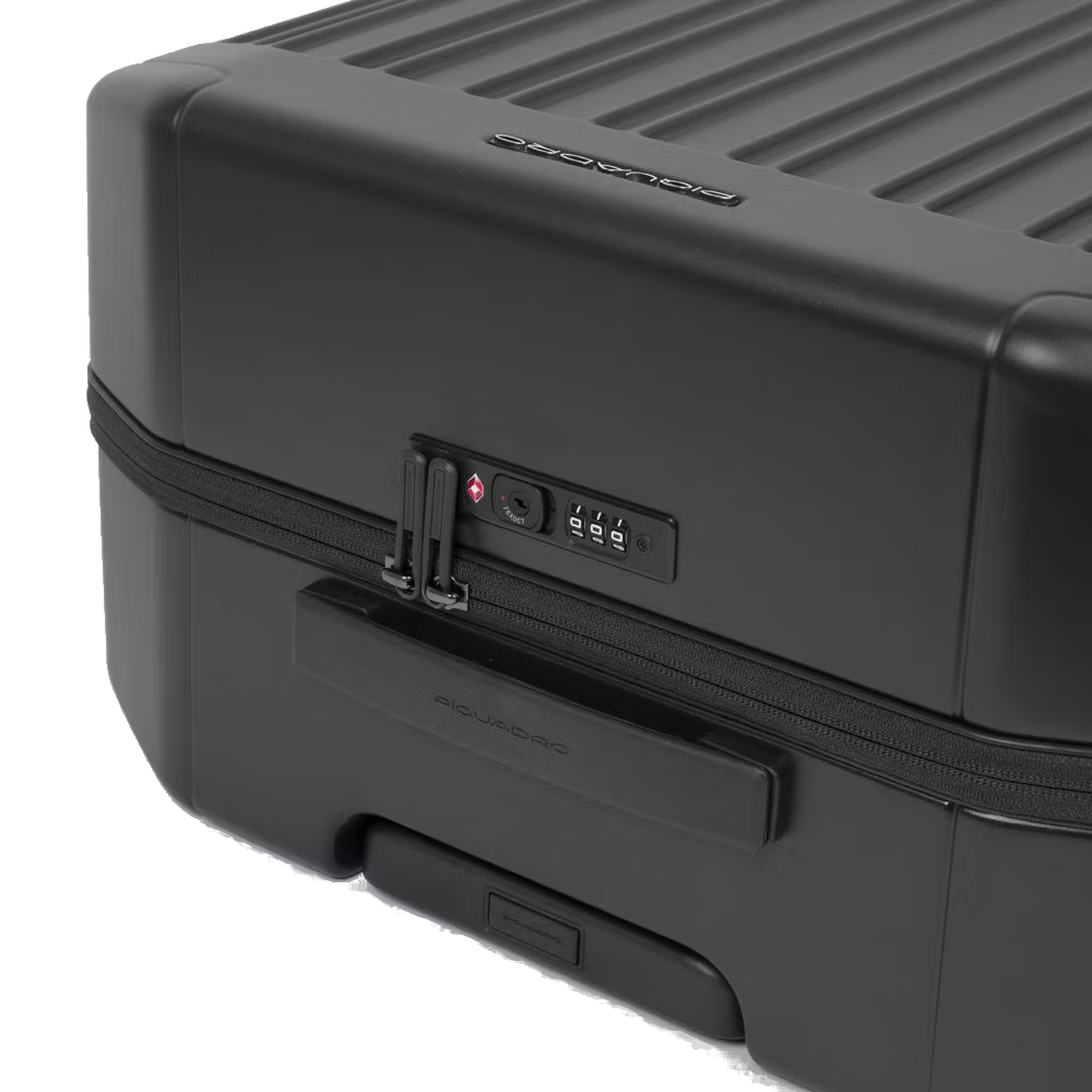 Raffinato trolley medio, rigido, ultraslim, a due scomparti, realizzato in resistente policarbonato antigraffio.  Chiusura lampo con doppia zip e lucchetto TSA. Dotato di quattro ruote in nylon seekers, estremamente stabili e silenziose. Maniglia a scomparsa.