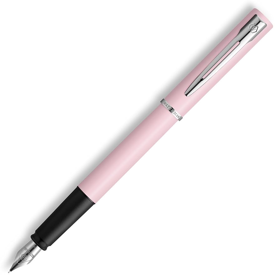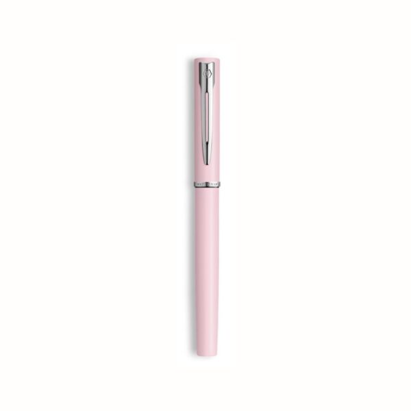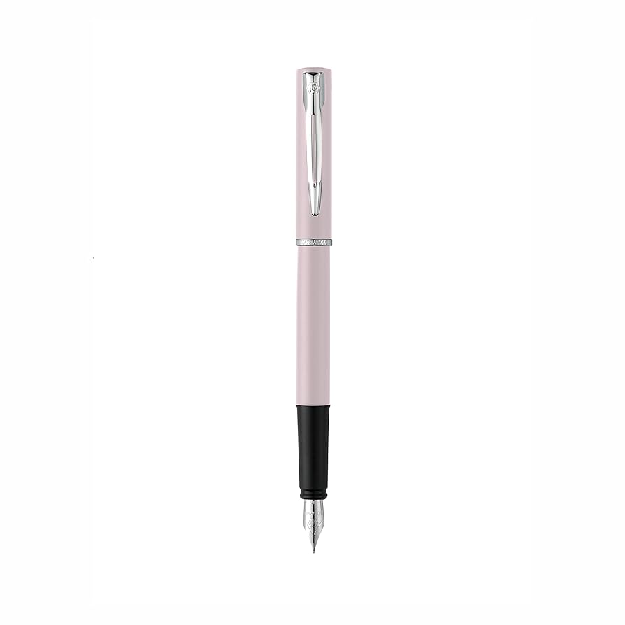 Raffinata e bellissima penna stilografica Watermann della linea Allure. Costituita da un corpo laccato opaco rosa pastello, finiture in acciaio cromato e pennino in acciaio inossidabile.