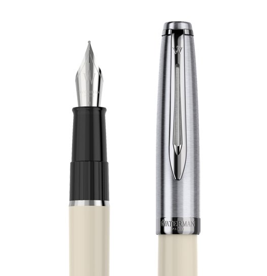 Raffinata e bellissima penna stilografica Watermann della linea Emblème . Ispirata alle linee architettoniche del paesaggio parigino è costituita da un corpo in resina bianca lucida, finiture in acciaio satinato e dettagli cromati. Pennino in acciaio inossidabile finemente decorato con rappresentazione della torre Eiffel.