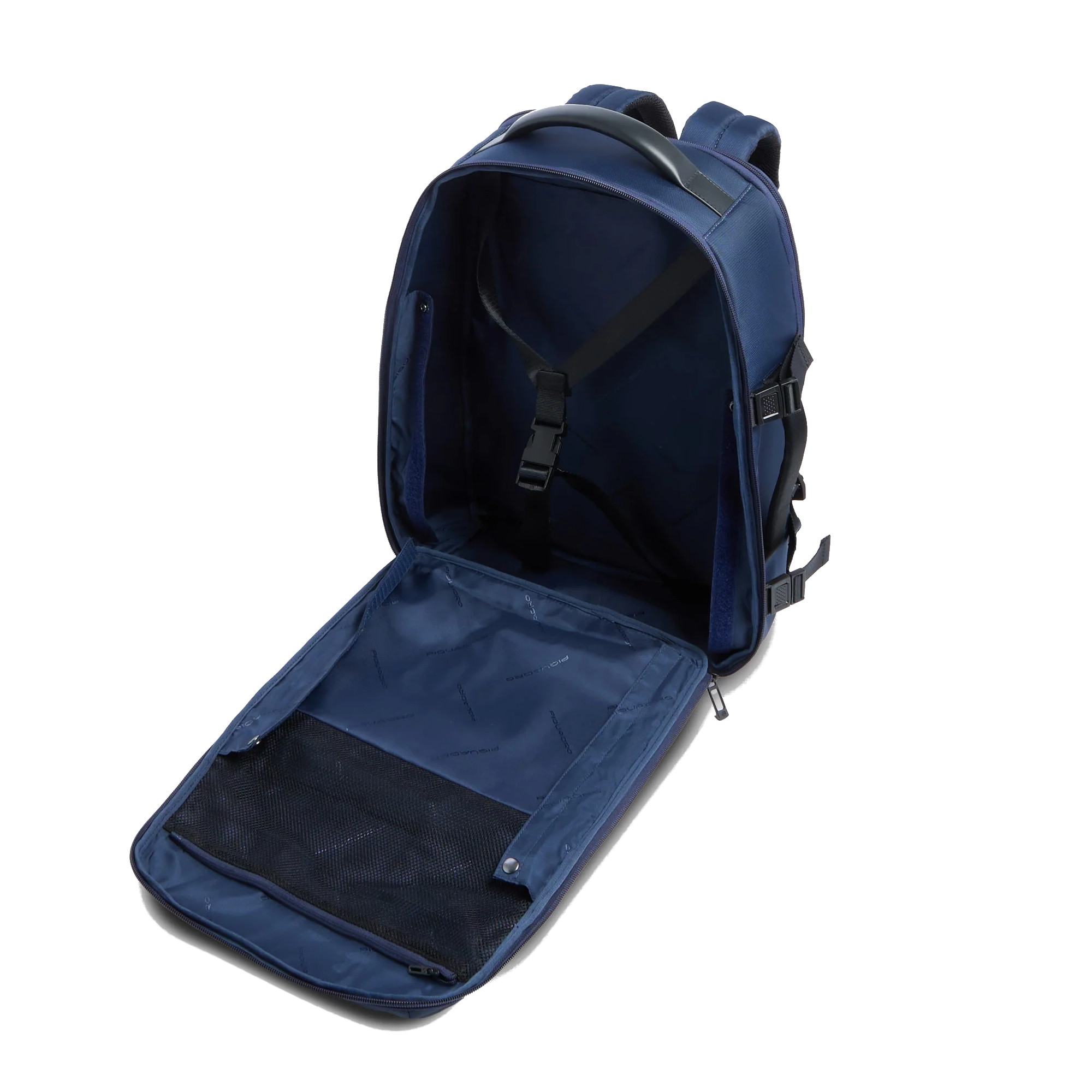 Pensato per il viaggio, integra comparto dedicato con cinghie ferma abiti, cinghie di compressione e porta bottiglia, assicurando ordine e praticità. Completano il design la protezione RFID, la fodera interna in 100% poliestere e i manici fissi per una presa stabile.