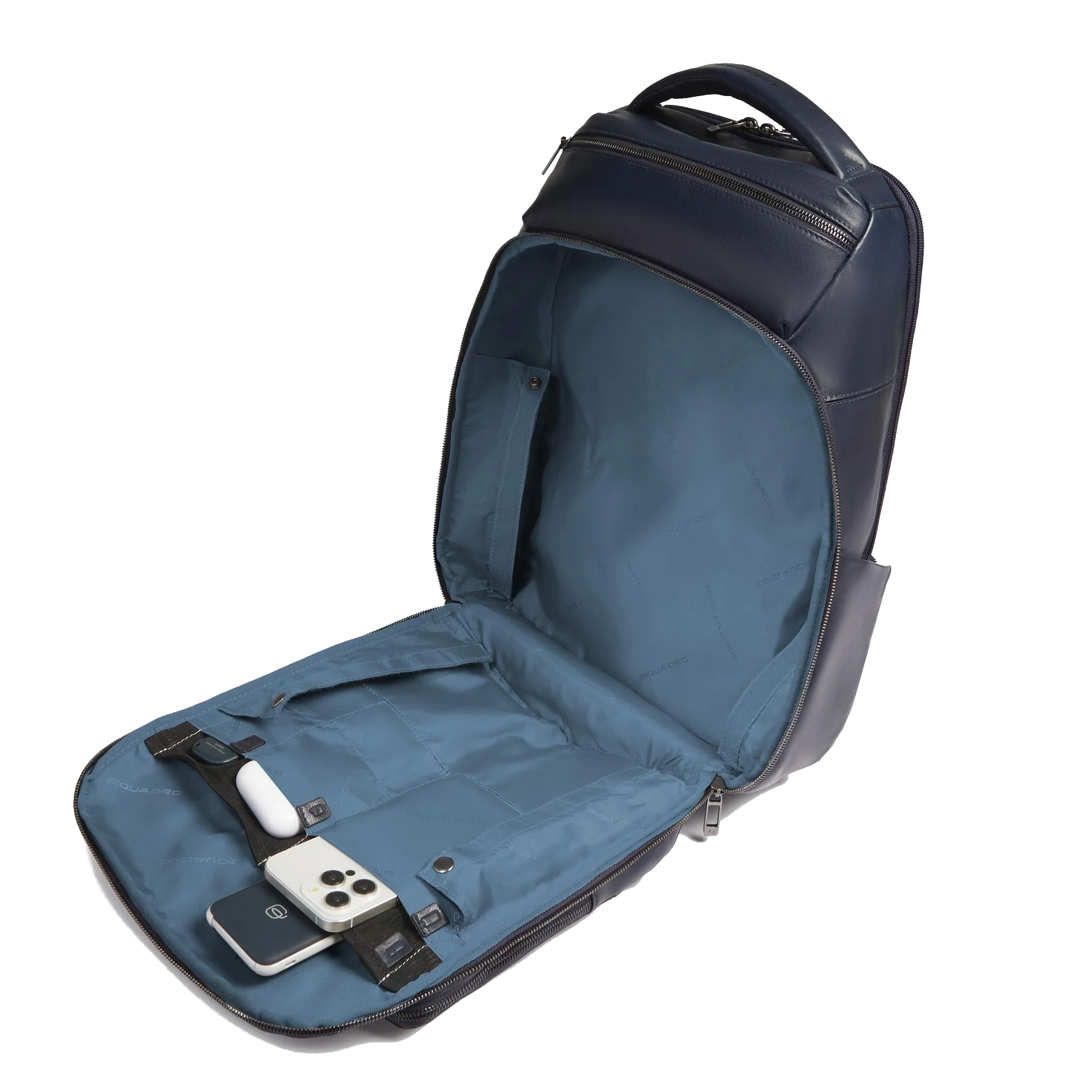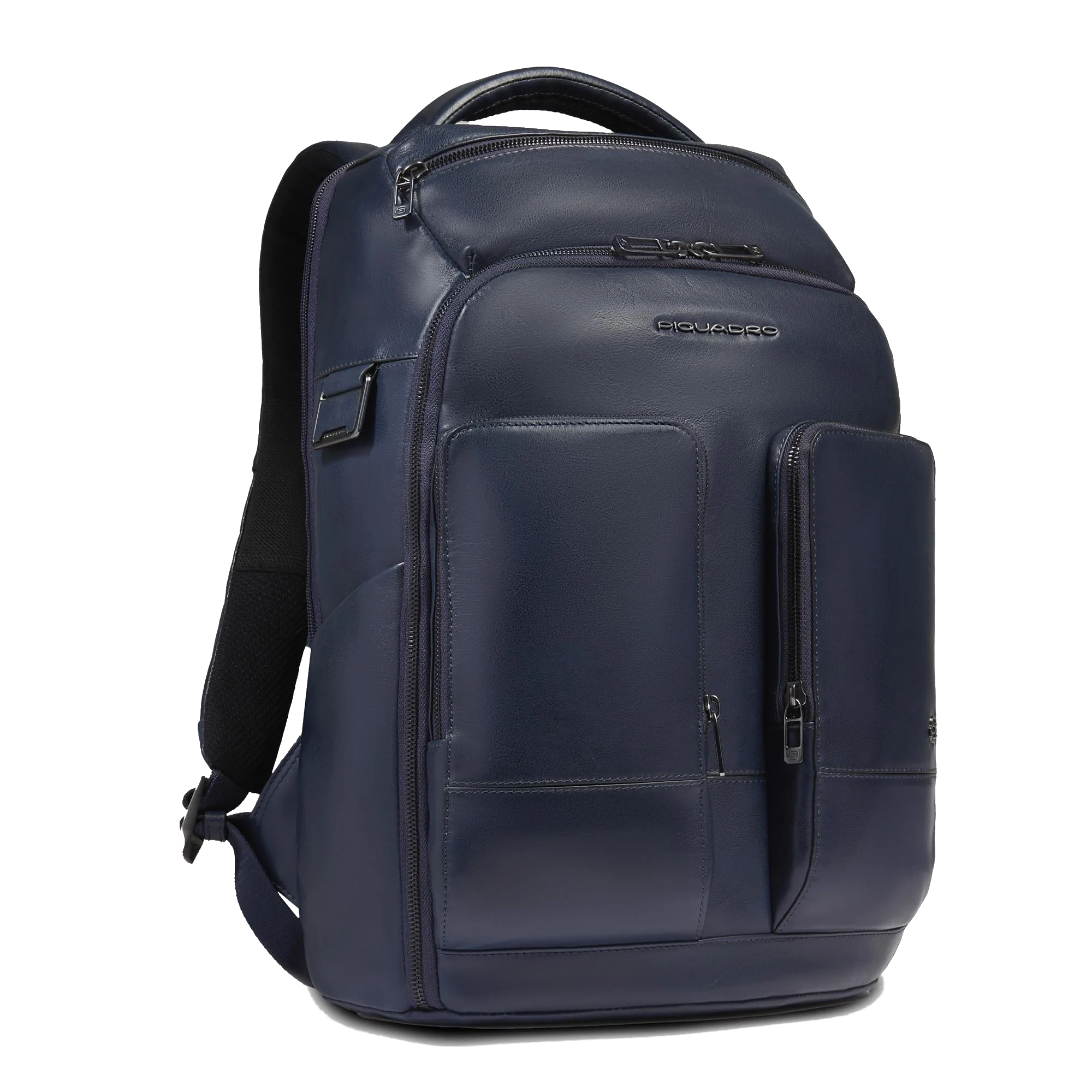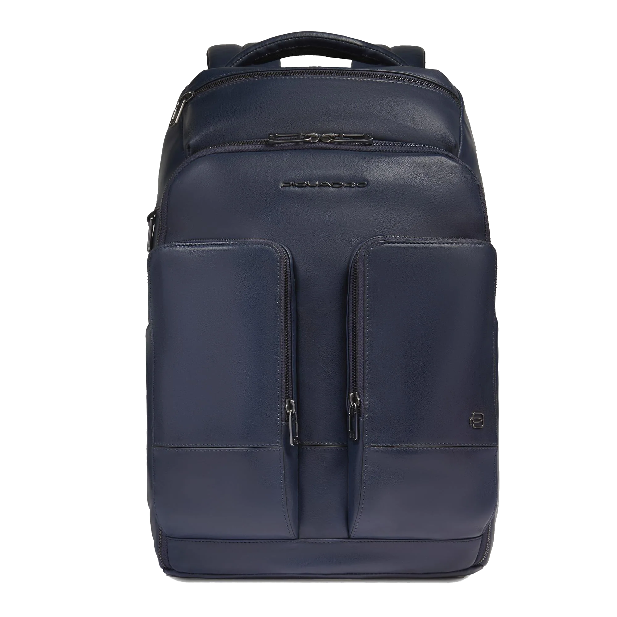 Pratico e super accessoriato zaino in pelle, disponibile in blu, marrone e verde.